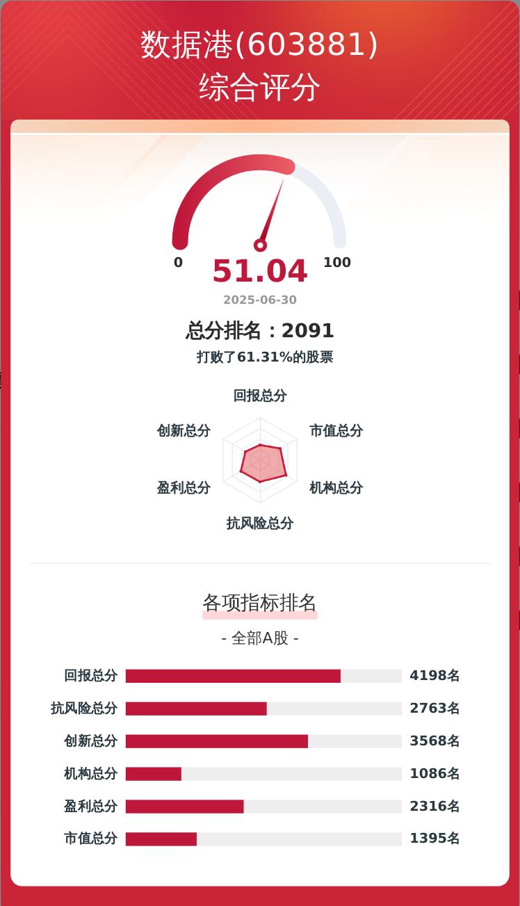 上市公司研究院构建了一套上市公司韧性评价体系,从企业盈利、科技创新、股东回报、经营抗风险、市值表现及机构吸引力六个维度对企业进行量化评分,满分为100分。数据港的韧性评价总分为51.04分,在A股5405家可比上市公司中排名第2091位。