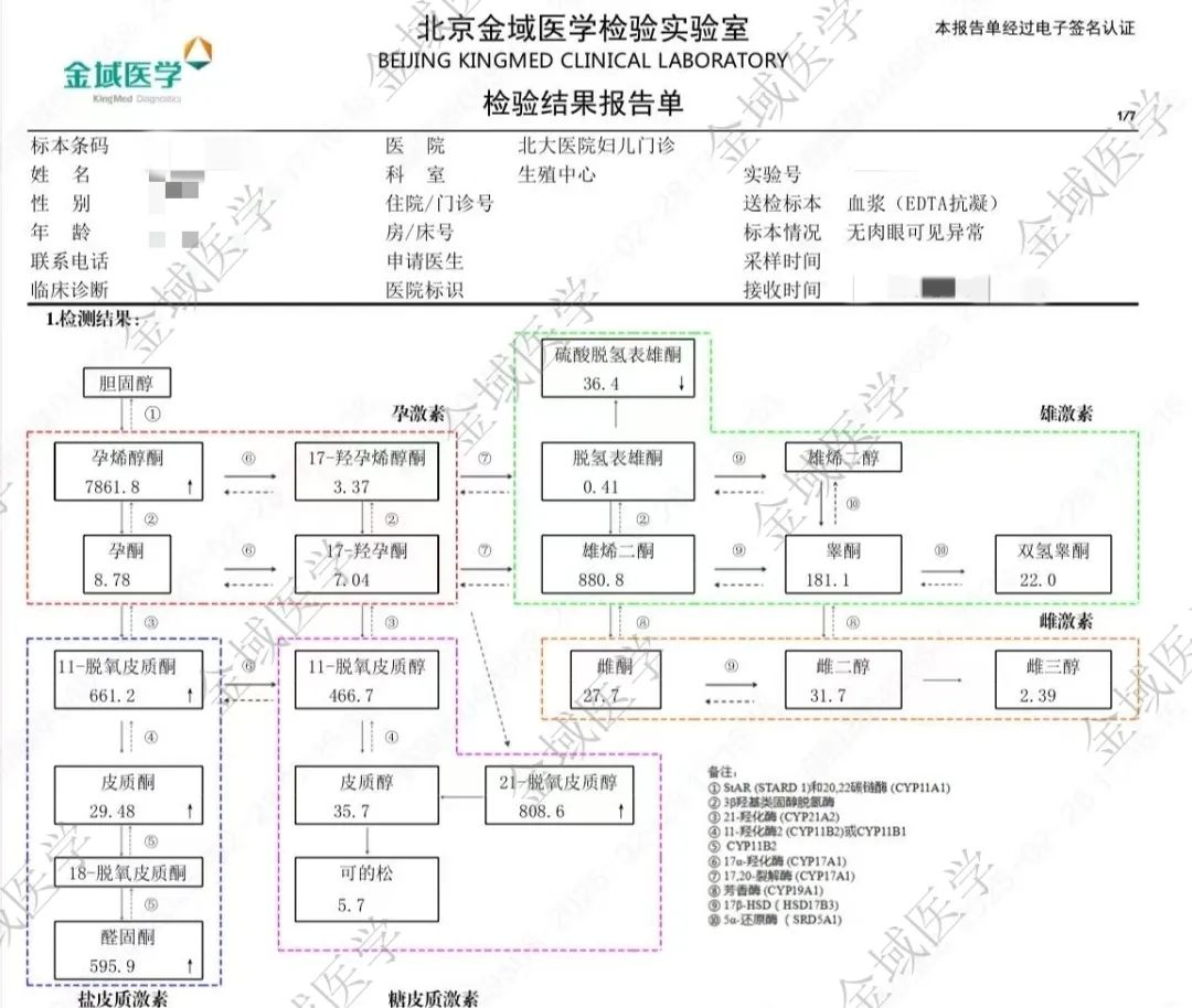 于是,杨医生将晓燕样本送至北京金域进行质谱法血浆类固醇激素代谢通路检测。