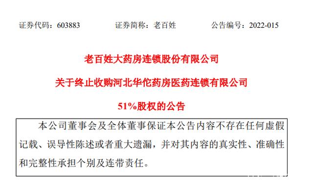 为维护公司整体利益,经董事会审议,老百姓决定根据《股权收购协议》约定解除交易协议,终止本次收购,并于2022年3月6日发函告知卖方,解除交易协议。