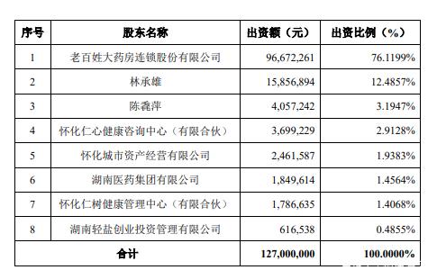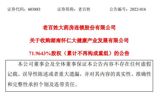 同日,老百姓发布关于《关于收购湖南怀仁大健康产业发展有限公司 71.9643%股权(累计不再构成重组)的公告》。