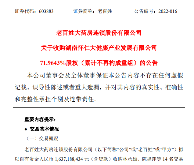 就在刚刚,老百姓大药房发布公告,宣布拟以16.37亿元收购怀仁大健康71.9643%的股权。