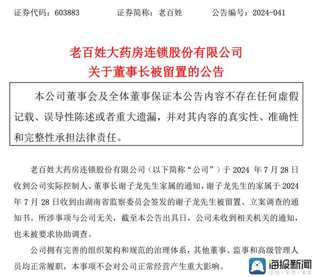 7月30日晚间,老百姓大药房连锁股份有限公司(下称“老百姓大药房”)发布公告称,该公司于2024年7月28日收到公司实际控制人、董事长谢子龙家属通知,家属收到了由湖南省监察委员会签发的谢子龙被留置、立案调查的通知书。