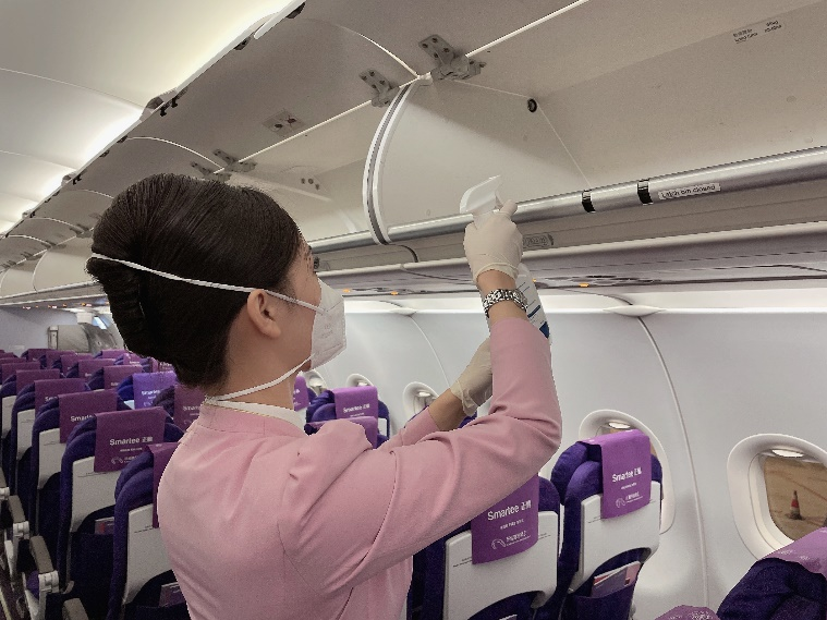 航班落地虹桥机场后,客舱乘务人员利用过站时间完成客舱清洁与消杀工作: