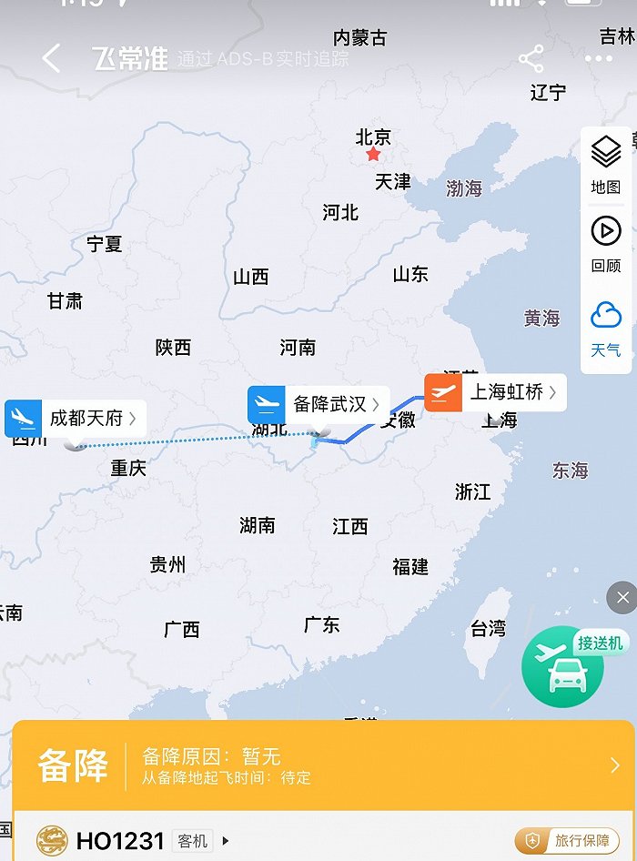 飞常准APP显示,吉祥航空HO1231航班于2月19日19:34分从上海虹桥起飞,原定于22:55分降落在成都天府机场,但是飞行轨迹显示,HO1231客机没有按照原计划抵达天府机场,而是中途备降在武汉天河机场。