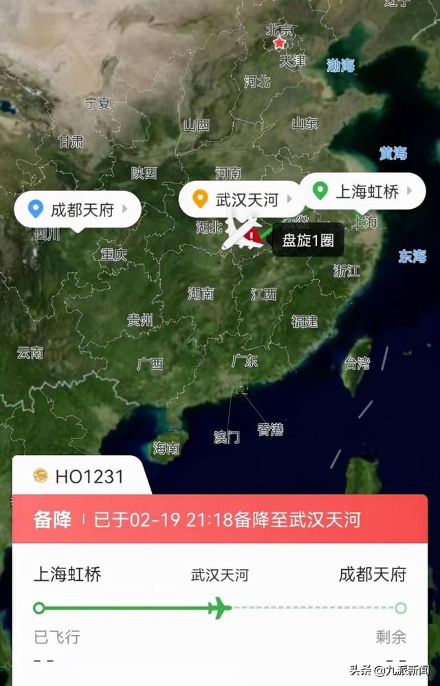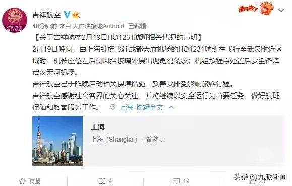 2月19日晚,吉祥航空从上海虹桥飞往成都的HO1231航班于19点34分起飞后,因“风挡现大面积蛛网裂纹”,临时改变飞行计划,备降武汉天河机场。