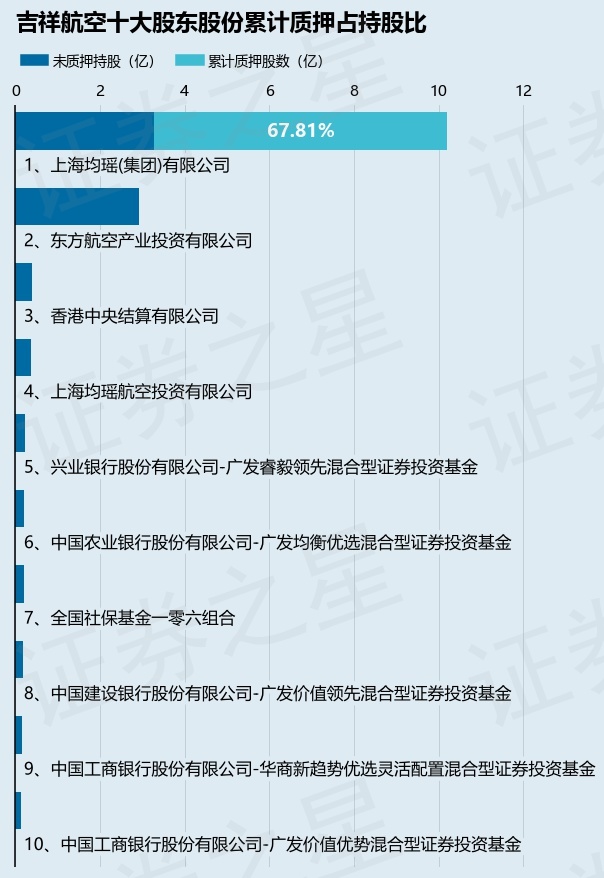 截止本公告日,股东上海均瑶(集团)有限公司已累计质押股份6.92亿股,占其持股总数的67.81%。本次质押后吉祥航空十大股东的累计质押股份占持股比例见下图: