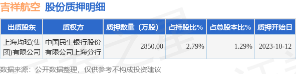 证券之星消息,吉祥航空(603885)10月14日公开信息显示,股东上海均瑶(集团)有限公司向中国民生银行股份有限公司上海分行合计质押2850.0万股,占总股本1.29%。质押详情见下表: