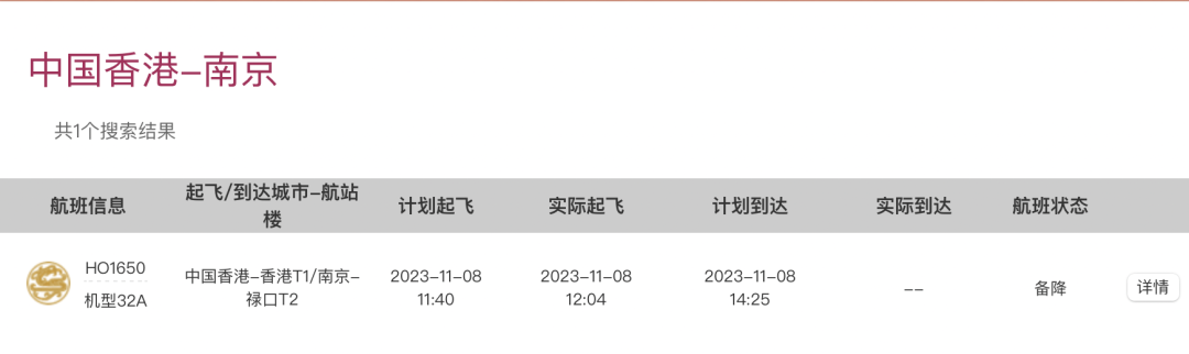 公开信息显示,HO1650航班 11月8日12:04从香港国际机场T1起飞,原定计划到达南京禄口机场的时间为14:25。