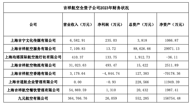 年报中,吉祥航空披露了8家全资子公司的业绩,其中,2023年九元航空营收36.48亿元,净利润2.61亿元;上海吉祥航空餐饮管理有限公司营收5.49亿元,净利润13.1亿元。