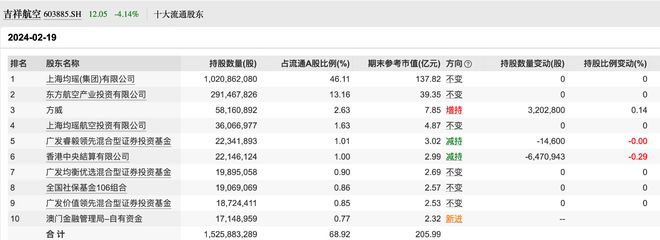 方威也并未持续增持吉祥航空股权,2022年年报中方威并未上榜。再次跻身吉祥航空十大股东之列已经到了2023年三季度,从三季报中的第九大股东又升至2023年年报中的第三大股东。据wind显示,截至2024年2月19日,方威仍为吉祥航空第三大股东,持股5816.09万股,持股比例2.63%。