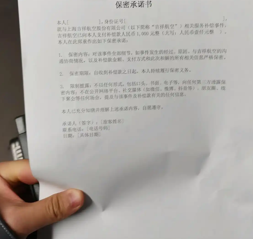 据乘客提供的保密承诺书显示,吉祥航空承诺给乘客1000元补偿,但要求乘客不能通过包括口头、书面、电子等在内的形式向第三方透露保密内容,也不能在公开网络平台、社交媒体、朋友圈、线下聚会等任何场合,提及与该事件及补偿款有关的任何信息。