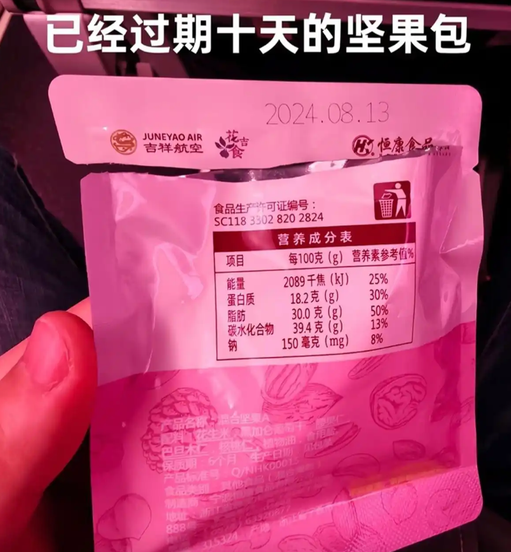 当时,坚果已经发放给了一半的乘客,有乘客在食用过程中注意到了过期问题。据该乘客提供的食品包装照片显示,该坚果产品包装上印有“吉祥航空”“花吉食”等字样,生产日期是2024年8月13日,保质期为6个月。