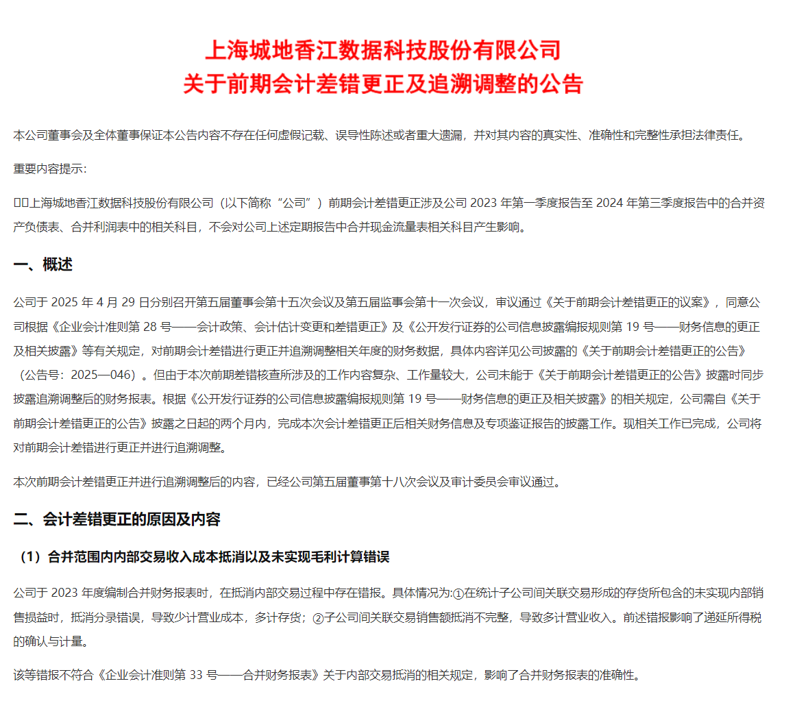6月29日,城地香江发布前期会计差错更正及追溯调整的公告。从2023年第一季度开始至2024年第三季度,城地香江连续7个季度的财务数据出错,涉及利润、收入和资产等多个报表科目。城地香江称,在业务执行层面,对部分业务原始单据的搜集、整理、内部传递及存档等方面的工作存在不及时的情况,导致部分IDC系统集成项目收入确认及存货暂估存在跨期。
