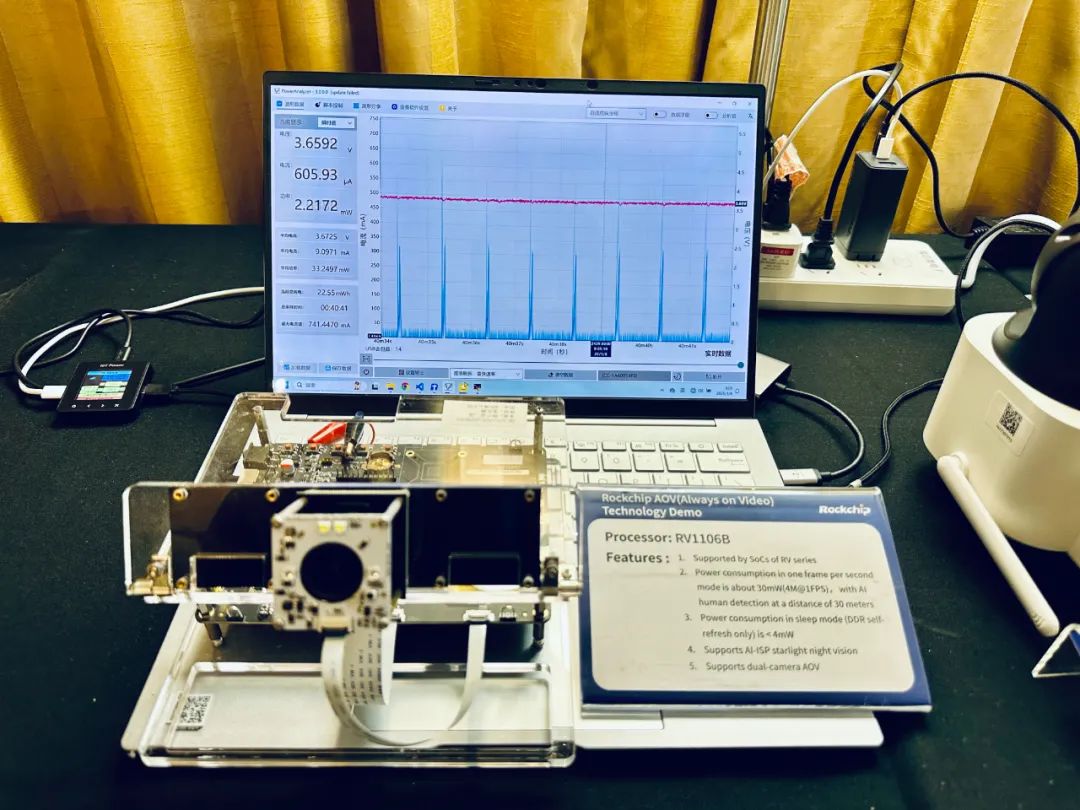 机器视觉展区,展示了基于瑞芯微多款视觉方案的丰富产品形态,包括4K60运动DV、AI智能视觉眼镜、双目AOV IPC、双目可视门铃、打猎机、医用内窥镜等,广泛应用在安防、娱乐、教育办公、医疗等场景。展品采用RV1106B系列及RK3576,重点演示了瑞芯微AOV超低功耗及新一代AI-ISP技术,支持一秒一帧或者一秒多帧低帧率全时录像,极低功耗运行;以及暗夜拍摄效果画面亮度及色彩还原度效果更好。