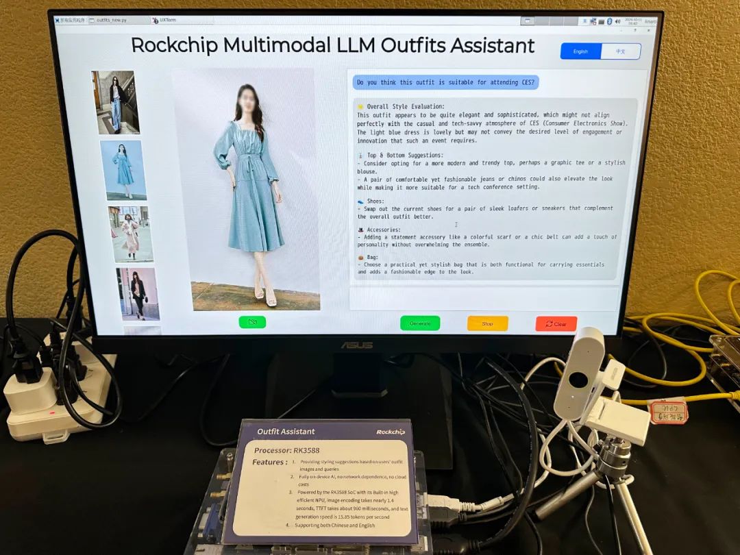AI算法展区展示的是最新推出的基于RK3588的智能助手及穿衣助理。智能助手利用端侧运行的LLM模型,可以解答各类问询,提供检索增强技术模块,可以通过添加不同的产品文档秒变各类产品专家;集成了ASR和TTS算法,让用户可以与其进行语音对话;并支持数字人技术,体验沉浸式交互。