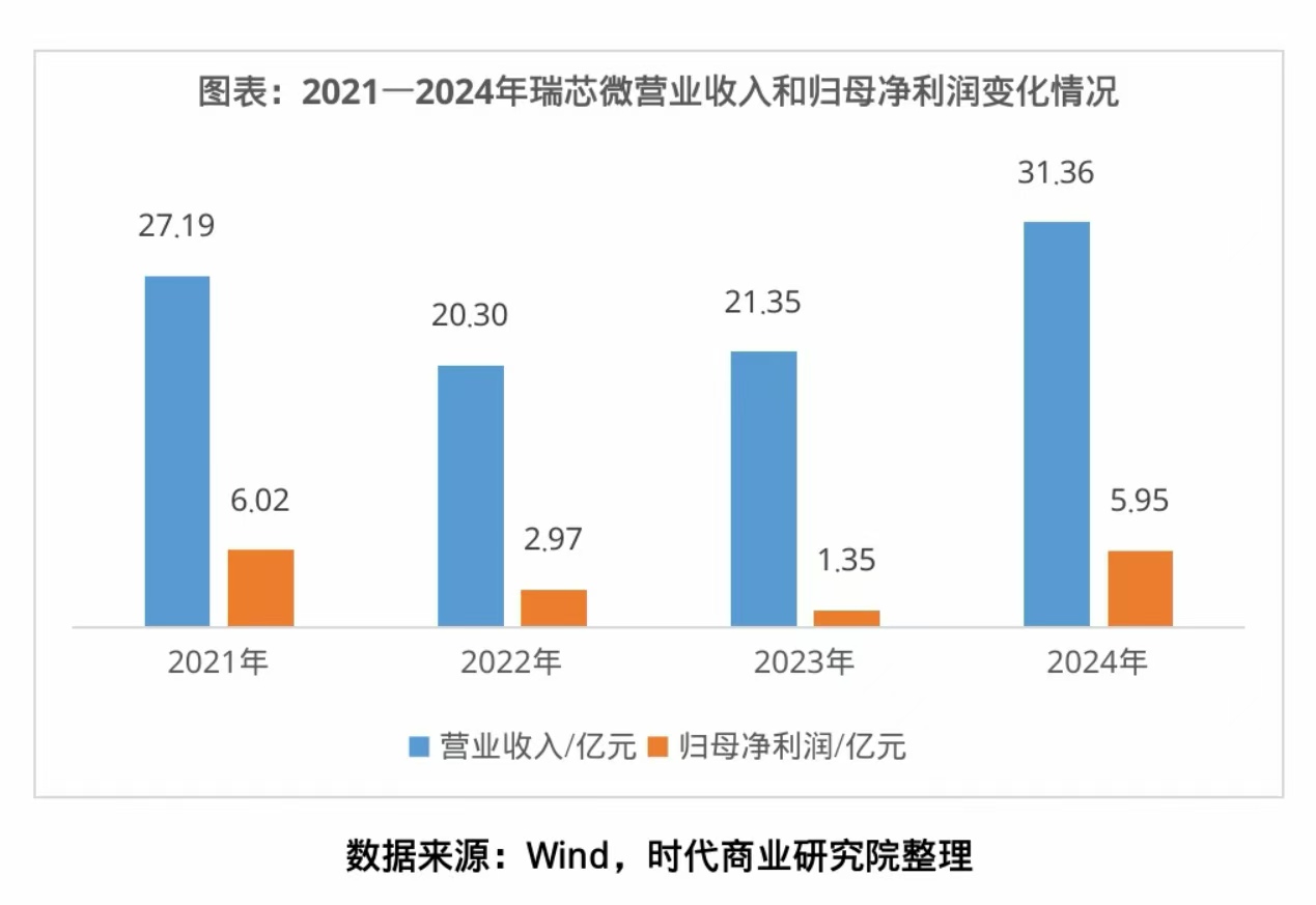 2021年起,受半导体市场竞争加剧影响,瑞芯微的业绩一度承压,营业收入从2021年的27.19亿元降至2023年的21.35亿元,同期归母净利润也从6.02亿元下滑至1.35亿元,整体表现不尽如人意。