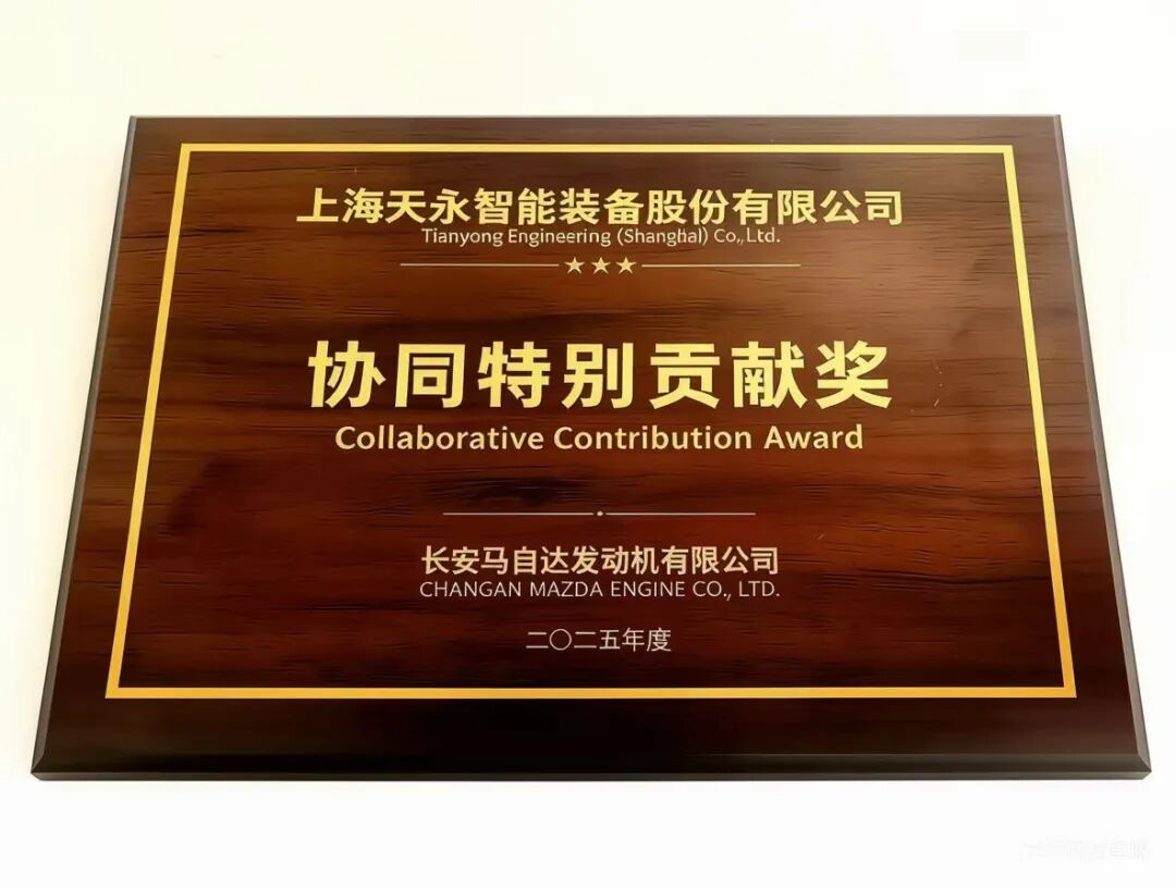 在近日举行的长安马自达发动机有限公司2025年度供应商大会上,上海天永智能装备股份有限公司凭借在技术协同、质量保障、交付支持等方面的突出表现,荣获大会颁发的“协同特别贡献奖”。天永智能总经理荣青出席大会并接受了这一重要荣誉。这一荣誉不仅体现了长安马自达发动机有限公司对我们专业能力与服务的高度认可,更是对双方长期信任与共赢合作的最佳注脚。