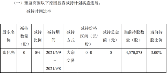 寿仙谷董事、高级管理人员减持股份进展公告显示,因个人资金需求,寿仙谷董事、副总经理郑化先拟自2021年6月9日至2021年12月8日期间,通过大宗交易方式减持不超过114.00万股公司股票。截至公告披露日,郑化先尚未减持公司股份。