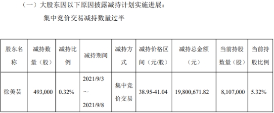 截至公告披露日,公司持股5%以上股东徐美芸持有公司人民币普通股共计810.70万股,占公司2021年9月7日总股本的5.32%,其中无限售条件流通股810.70万股。