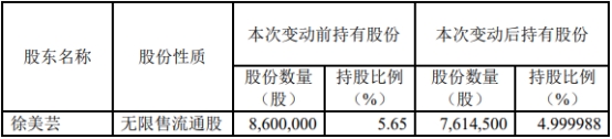 本次权益变动后,徐美芸持有寿仙谷股份761.45万股,占公司2021年9月13日总股本的4.999988%。