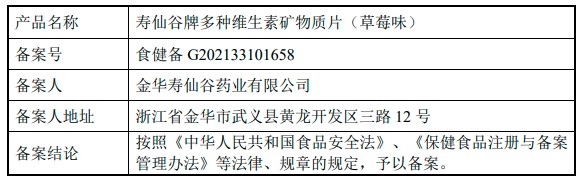 公告显示,近日,寿仙谷全资子公司金华寿仙谷药业有限公司“寿仙谷牌多种维生素矿物质片(草莓味)”产品完成了国产保健食品备案工作,并获得浙江省市场监督管理局发放的国产保健食品备案凭证。