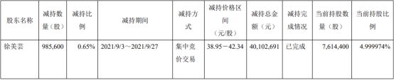 昨日晚间,寿仙谷发布持股5%以上股东减持股份结果公告。因个人资金需求,寿仙谷股东徐美芸拟自2021年9月3日至2022年2月28日通过集中竞价交易和大宗交易方式减持不超过98.57万股。截至公告披露日,徐美芸通过集中竞价交易方式减持98.56万股,占公司2021年9月24日总股本的0.65%,减持总金额为4010.27万元。本次减持计划实施完毕。