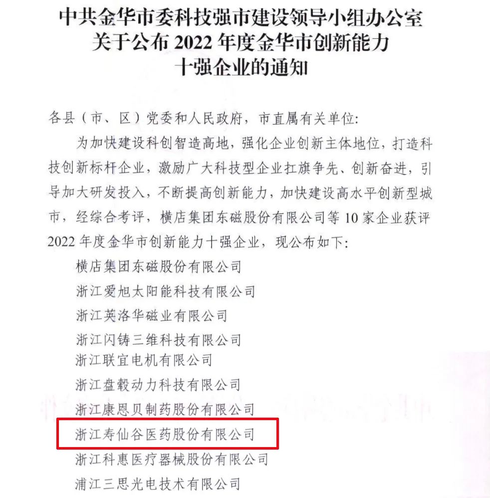 为加快建设科创智造高地,强化企业创新主体地位,打造科技创新标杆企业,中共金华市委科技强市建设领导小组办公室组织开展“2022年度金华市创能能力十强企业”评选,经综合考评,浙江寿仙谷医药股份有限公司等10家企业获评。