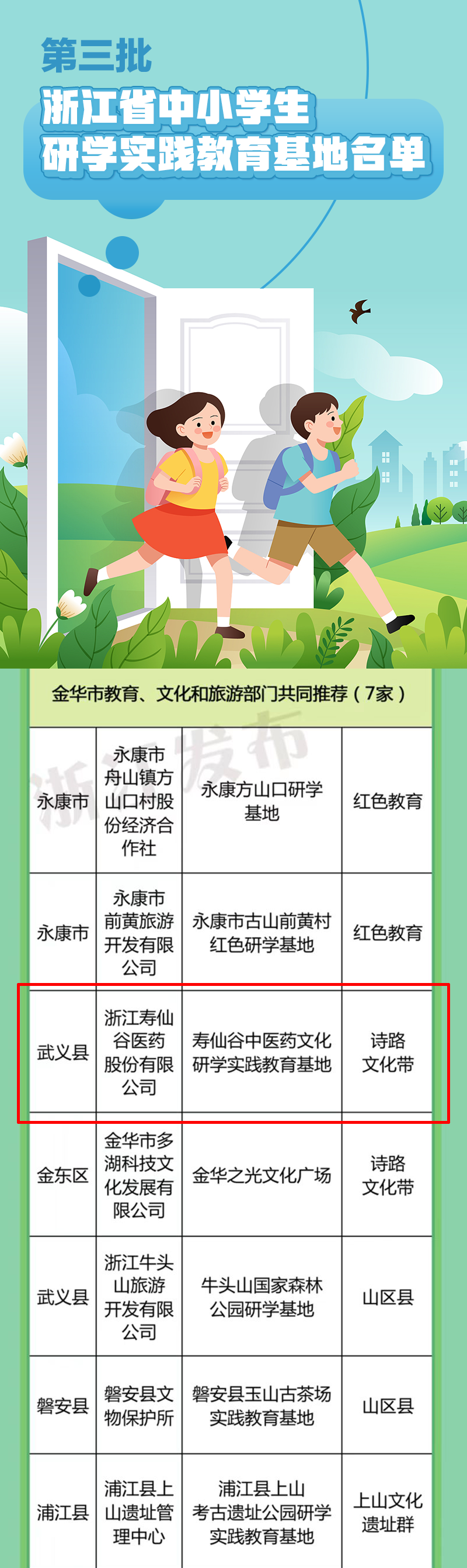 近日,浙江省教育厅办公室、省文化和旅游厅办公室印发通知,认定全省76家基地为浙江省中小学生研学实践教育基地,寿仙谷中医药文化研学实践基地榜上有名。