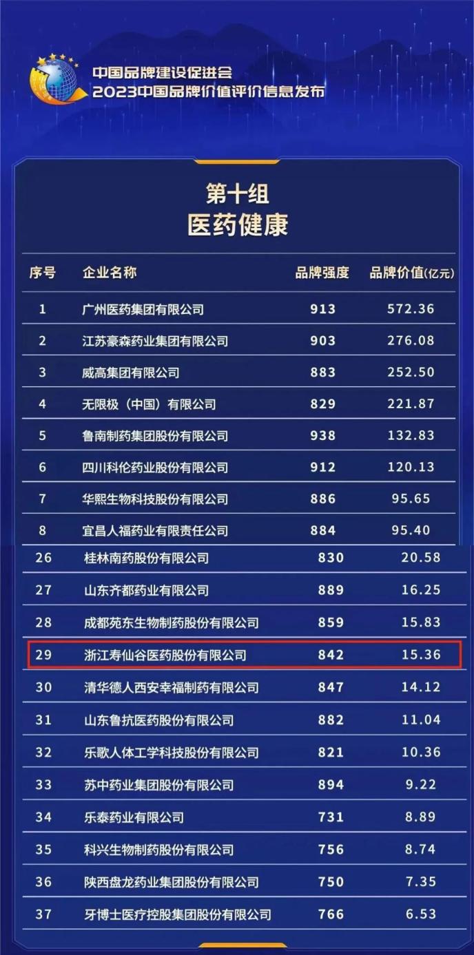 5月11日,“2023中国品牌价值评价信息发布”在浙江举行。浙江寿仙谷医药股份有限公司以842的品牌强度、15.36亿元的品牌价值,位列全国医药健康行业第29名。