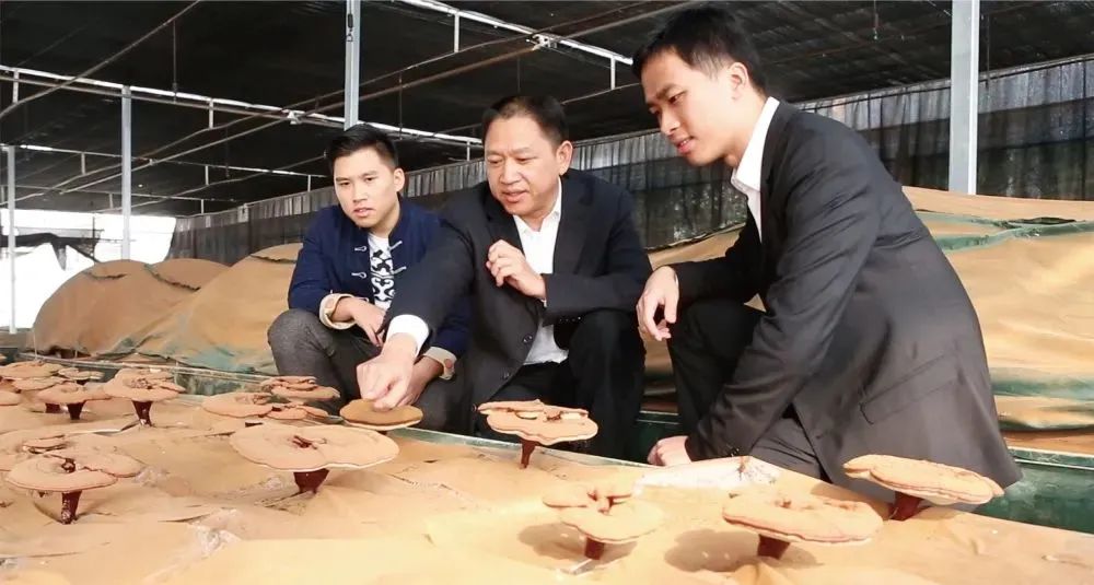 ▲李振宇与父亲李明焱、哥哥李振皓,在寿仙谷有机国药基地研究灵芝
