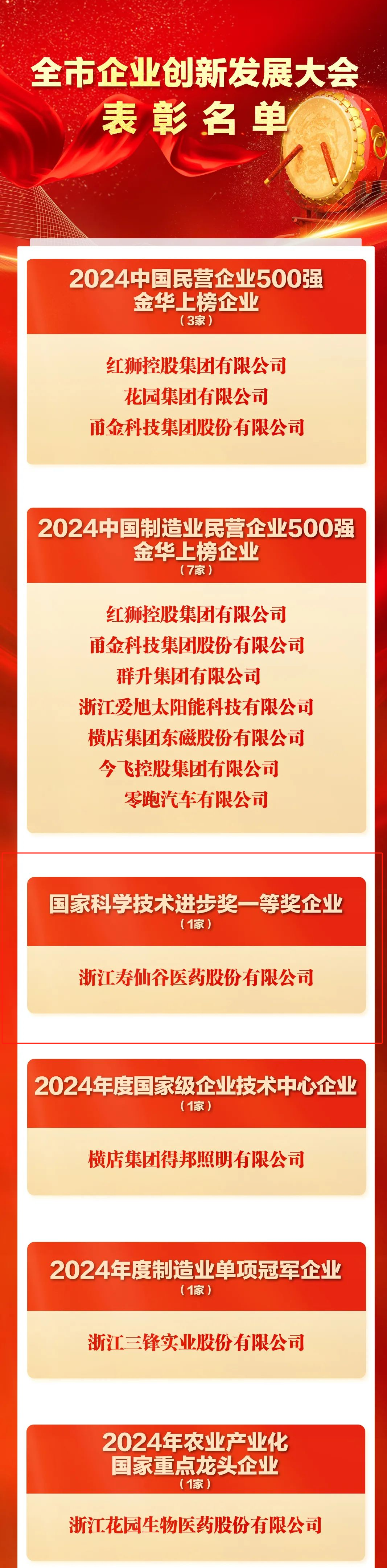 2月10日,金华市召开全市企业创新发展大会。市委书记朱重烈出席并讲话。大会由金华市委副书记、市长张健主持。会上,寿仙谷公司作为“国家科学技术进步奖一等奖”获奖企业受到表彰,李明焱董事长围绕“科技引领推动中药产业高质量发展”主题作交流发言。