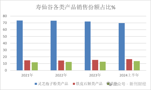 根据寿仙谷2024年半年度报告,其产品结构主要由灵芝孢子粉类产品、铁皮石斛类产品以及其他产品组成。其中,灵芝孢子粉类产品在公司总营收中占比最高,达到69.75%,是公司的核心产品;铁皮石斛类产品占比为16.71%,其他产品占比则为13.55%。近年来,这一产品结构比例基本保持稳定,灵芝孢子粉类产品始终占据主导地位,且各产品占比在小幅范围内波动。