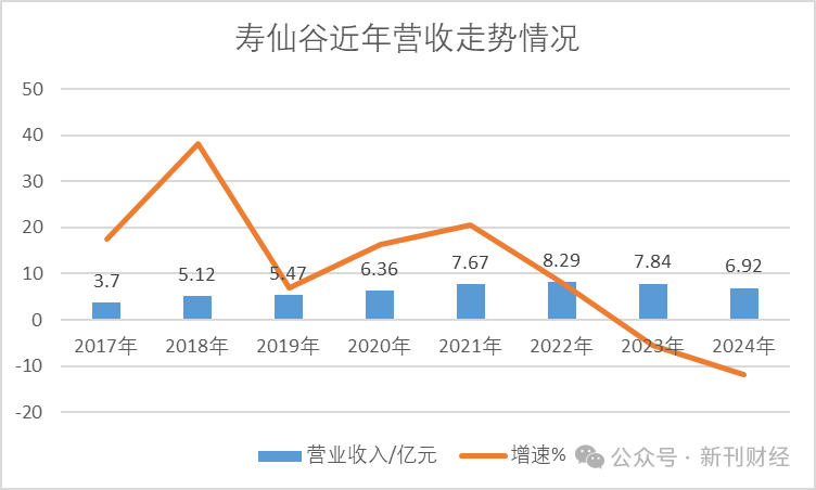 寿仙谷自2017年5月登陆上交所以来,营收曾保持连续六年正增长,从上市初期的3.7亿元攀升至2022年的历史峰值8.29亿元,累计增幅达124%。然而,这一增长趋势在2023年首次中断,全年营收同比下降5.39%至7.84亿元。2024年业绩进一步恶化,营收同比降幅扩大至11.81%,创上市以来最大跌幅。
