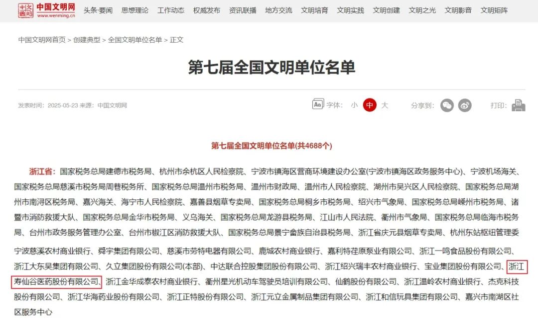 近日,全国精神文明建设表彰大会在北京召开,浙江寿仙谷医药股份有限公司等单位被中央宣传思想文化工作领导小组授予“第七届全国文明单位”荣誉称号。这一国字号荣誉,不仅是对寿仙谷在物质文明与精神文明建设中取得卓越成就的最高褒奖,更是对其作为中医药行业标杆,以文明力量驱动企业高质量发展、勇担社会责任的高度认可。