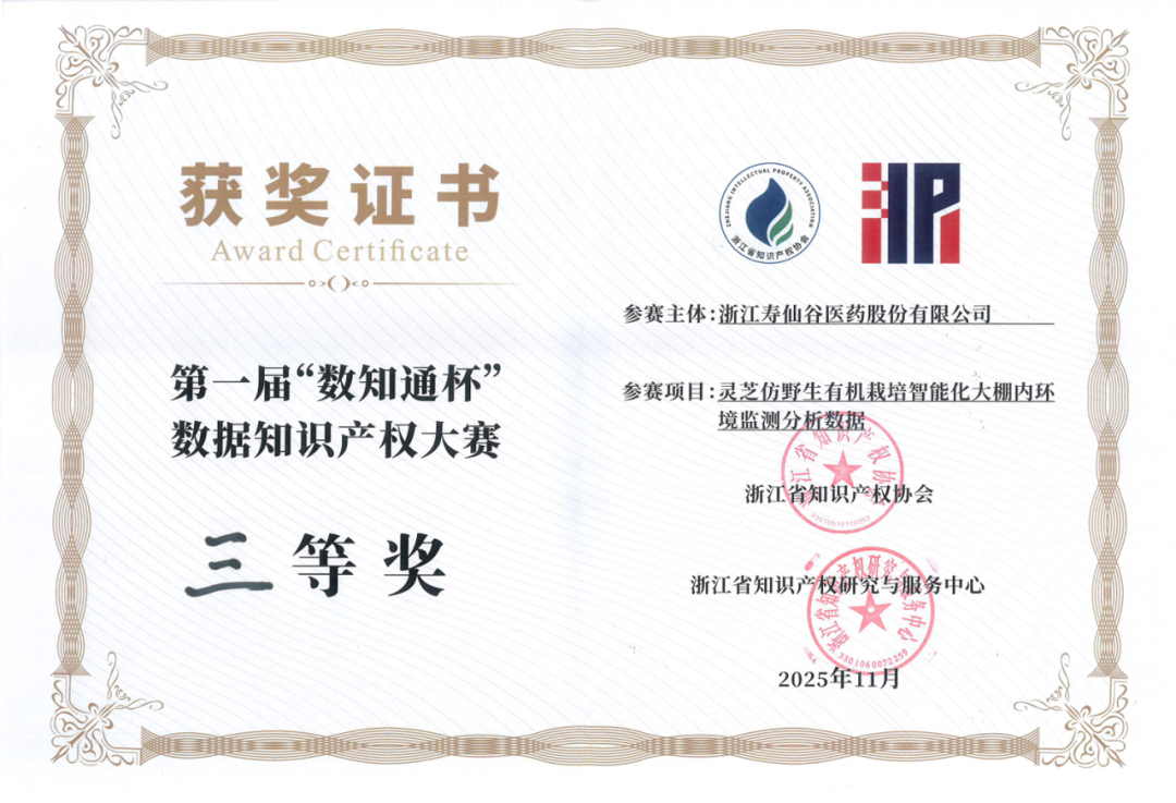 近日,由浙江省知识产权局指导, 浙江省知识产权协会 、 浙江省知识产权研究与服务中心 联合举办的第一届“数知通杯”数据知识产权大赛获奖名单正式公布。 寿仙谷 凭借参赛项目“灵芝仿野生有机栽培智能化大棚内环境监测分析数据”荣获大赛三等奖。