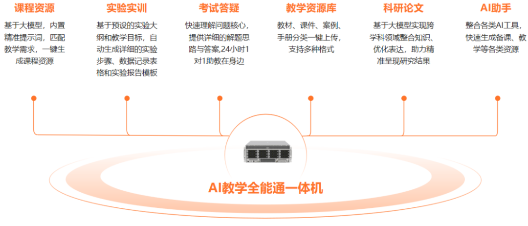 AI教学全能通一机体解决方案基于长城科技高性能GPU服务器,融合了当下最先进的大语言模型,支撑教学内容智能生成、自学路径智能规划、知识内容智能梳理、私有知识智能答疑等核心应用,涵盖教学过程全周期,面向教师、学生两类对象,具备提供高效备课、生成实验手册、代码纠错、在线实验、课程学习等关键功能。一体机单节点可以满足60—80个教师及学生并发使用,并且支持横向扩展。