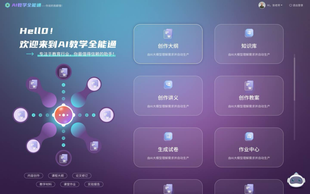 大纲生成、试题/试卷生成、报告生成、课件生成、论文润色、知识回答、知识库管理