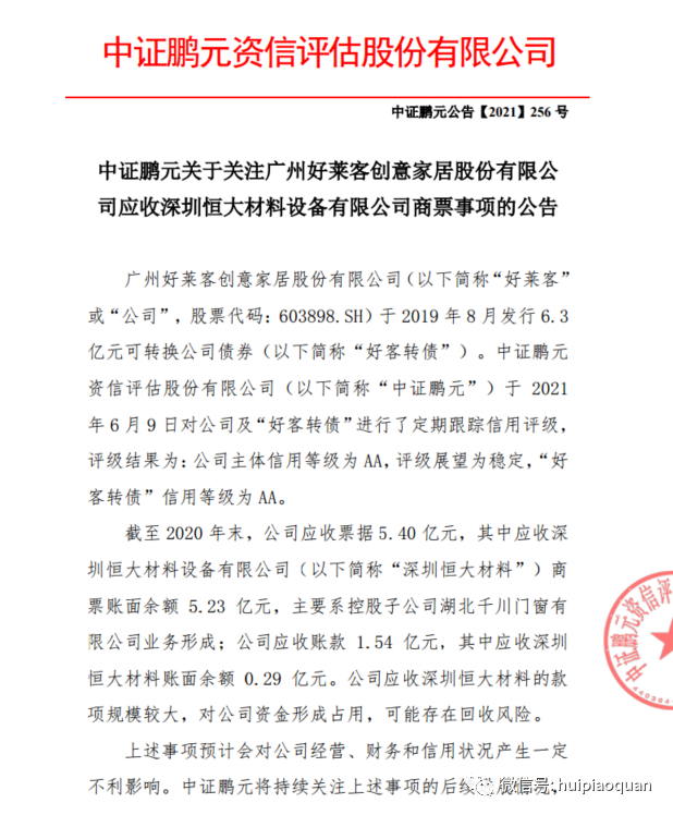 据中证鹏元消息:截至 2020 年末,好莱客公司应收票据 5.40 亿元,其中应收深圳恒大材料设备有限公司(以下简称“深圳恒大材料”)商票账面余额 5.23 亿元,主要系控股子公司湖北千川门窗有限公司业务形成;公司应收账款 1.54 亿元,其中应收深圳恒大材料账面余额 0.29 亿元。公司应收深圳恒大材料的款项规模较大,对公司资金形成占用,可能存在回收风险。