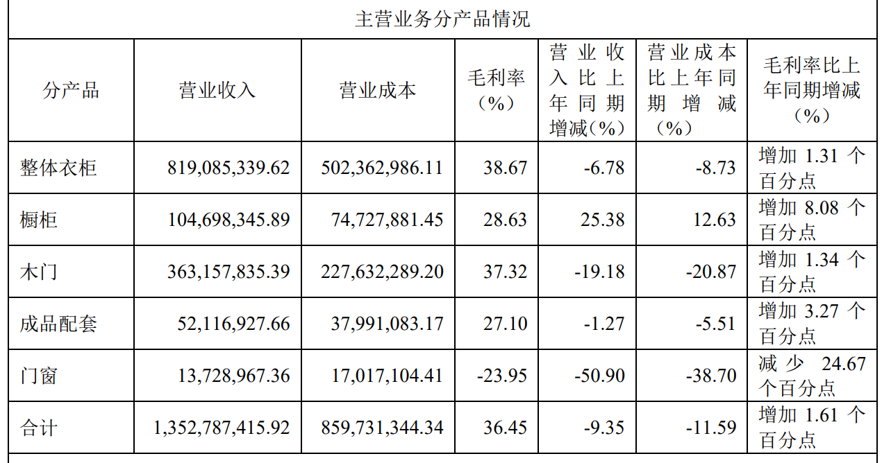 整体衣柜、成品配套营业收入较上年同期分别减少6.78%、1.27%,主要是受疫情及房地产行业宏观环境影响所致