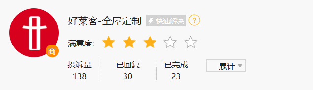 《消费者报道》在黑猫投诉平台上注意到,好莱客的累计投诉量为138(截至2月16日10点),已回复/已完成的量不足22%。满意度评价为三星。部分投诉集中在量尺错误、拖欠退款、产品气味刺激等问题上。