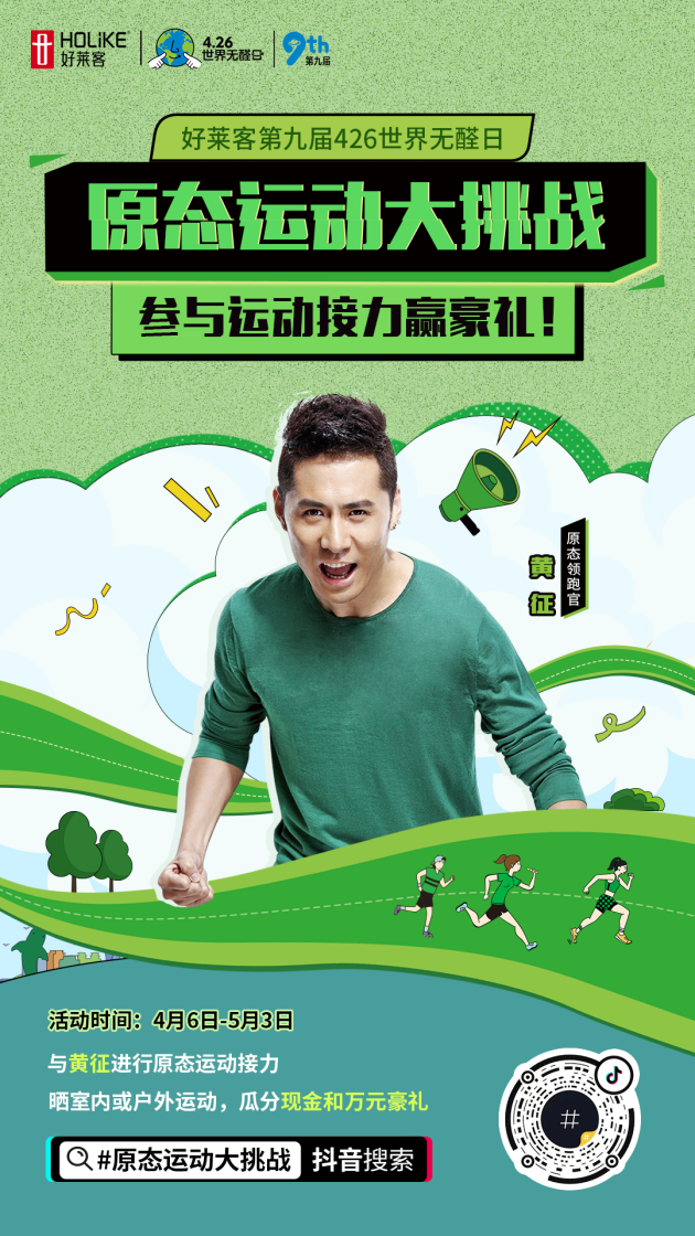 不仅有众多线下趣味领跑活动,好莱客还将联动全国经销商,于年轻人聚集的抖音、小红书、微信等线上社交平台创新玩转世界无醛日,以高流量多领域辐射全网,让更多的群体参与到原态生活方式。抖音上,好莱客联合明星、运动达人共同发起#原态运动大挑战#全民接力挑战赛,打开抖音搜索话题#原态运动大挑战,点击“立即参与”,用抖音视频/图片晒出你的运动时刻,并@好莱客全屋定制,与黄征进行原态运动接力,即有机会瓜分现金大奖和价值万元奖品,共掀全民原态健康运动热潮。