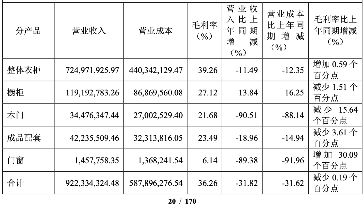 具体来看,好莱客5大主营产品中,除橱柜的营业收入同比上涨16.25%之外,其余4大主营产品均出现营收的同比下滑,其中“门窗”和“木门”2个产品营业收入的同比下滑幅度均高达90%左右。
