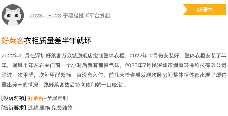 在知名消费者投诉平台“黑猫”上,8月23日,有消费者投诉称“好莱客衣柜质量差半年就坏”,该消费者描述称,在好莱客定制了整体衣柜,去年12月份安装好后通风半年仍有刺鼻气味,请了专业公司去甲醛但次卧甲醛依然超标,随后还发现次卧房间整体柜体都出现爆边露出碎末的情况。