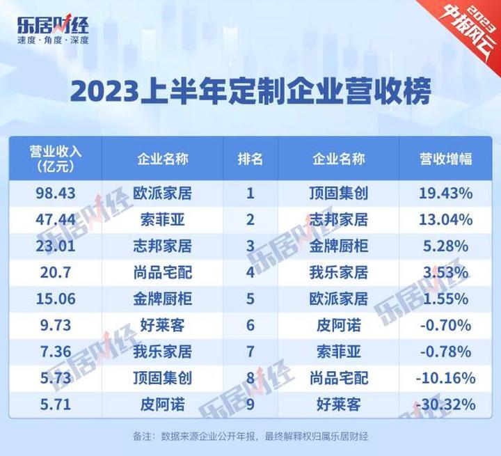 全屋定制的风口吹了几年,但从今年上半年各大公司公布的半年报数据来看,该领域内的企业却过得并不容易。近期,乐居财经《家居k线》对已上市的9家定制类上市企业公布的2023年上半年业绩进行对比分析,仅3家企业营收、净利润出现同比增长。