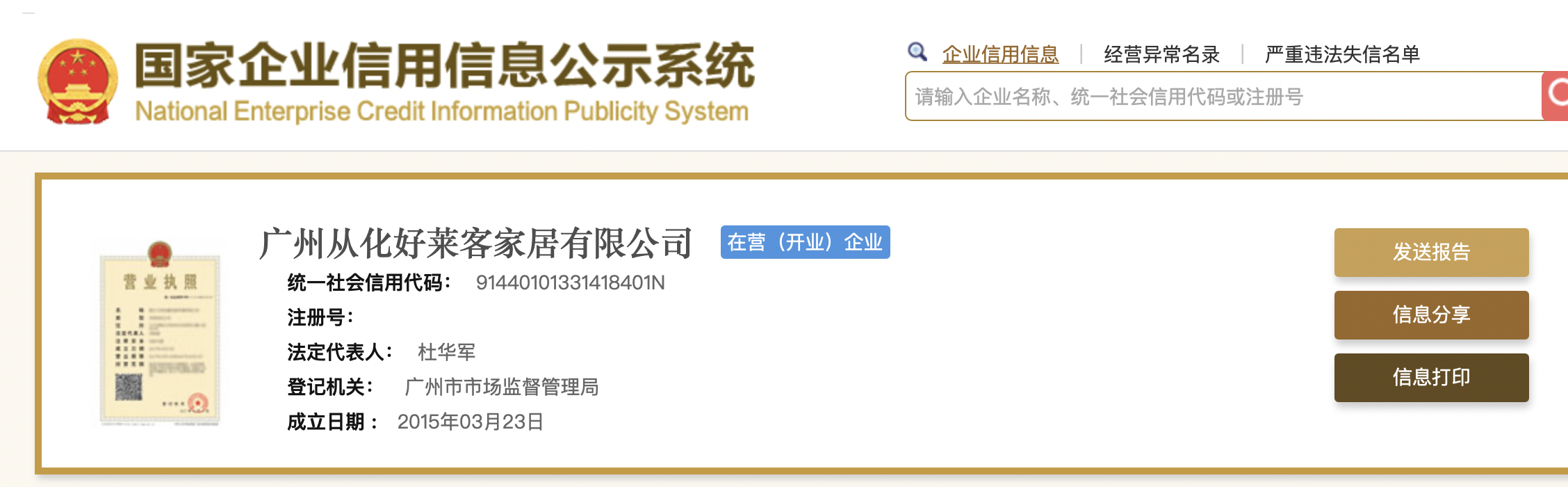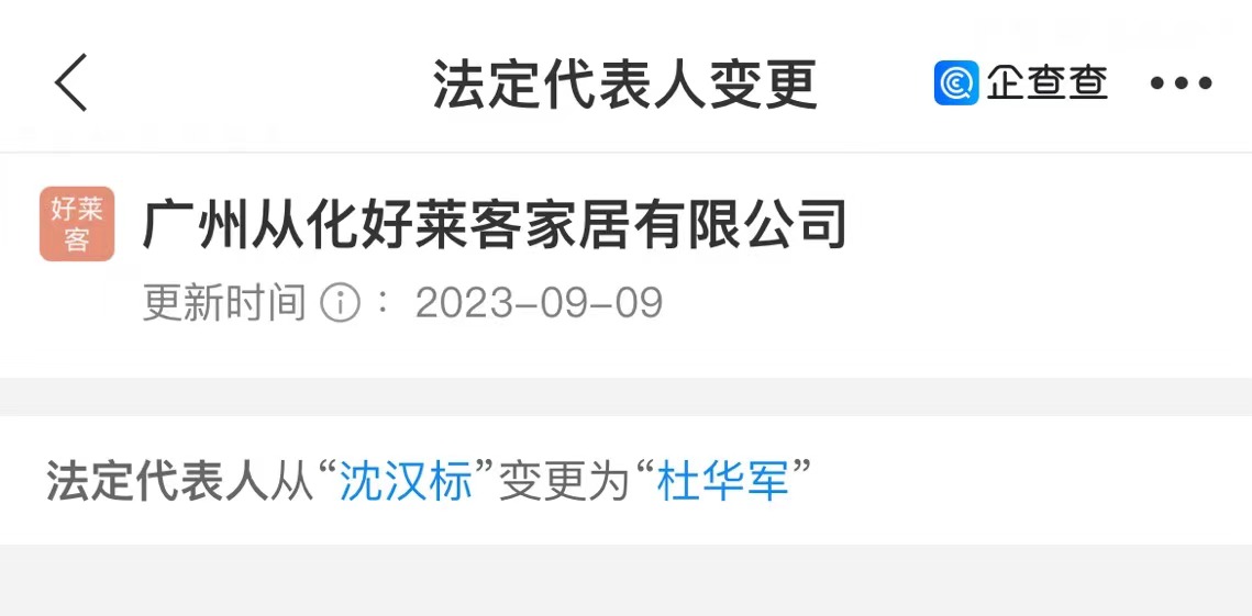 9月11日,广州从化好莱客家居有限公司(以下简称“广州从化好莱客家居”)法人代表发生变更,由沈汉标变更为杜华军。