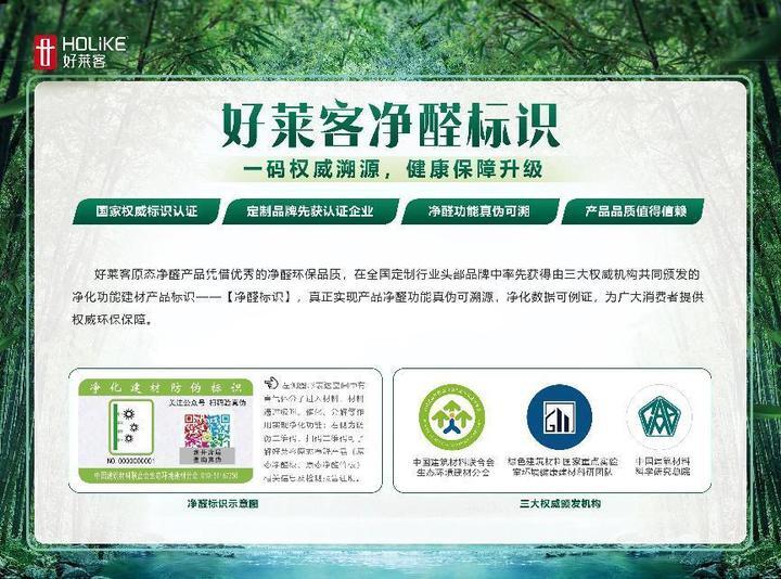 值得一提的是,近期,好莱客原态净醛产品凭借优秀的净醛环保品质,在全国定制行业头部品牌中率先获得由三大权威机构共同颁发的净化功能建材产品标识——【净醛标识】,真正实现产品净醛功能真伪可溯源,净化数据可例证,为广大消费者提供权威环保保障。【净醛标识】的获得,是行业及消费者对好莱客原态净醛产品在环保方面的极大肯定,也是好莱客作为环保家居标杆企业的又一环保高峰攀登!