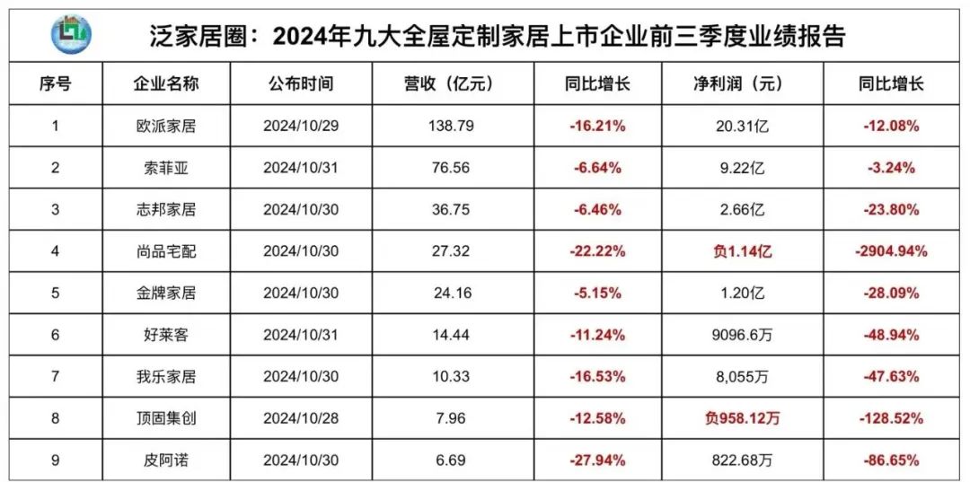 笔者对九大定制家居上市企业2024年前三季度经营数据统计显示,去年三季度“营利双降”成为行业主基调,受宏观大环境与房地产行业的影响,“价格战”烽烟不断,严重挤压利润空间,终端产品价格倒挂严重,客单价大幅降低,行业龙头也不例外,经营压力加大,大量经销商还深陷亏损乃至跑路漩涡。