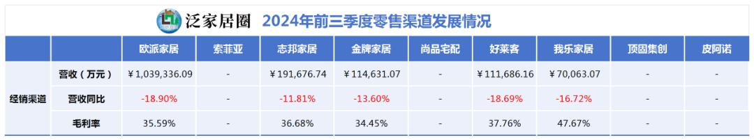 从经销零售渠道营收的角度看,欧派家居前三季度营收103.93亿元位居榜首,但营收同比下降了18.90%,也是下跌最高的,志邦家居则是同比下滑11.81%,金牌家居同比下滑13.60%,好莱客同比下滑18.69%,我乐家居同比下滑16.72%。注:索菲亚、尚品宅配、皮阿诺、顶固未披露相关经营数据。