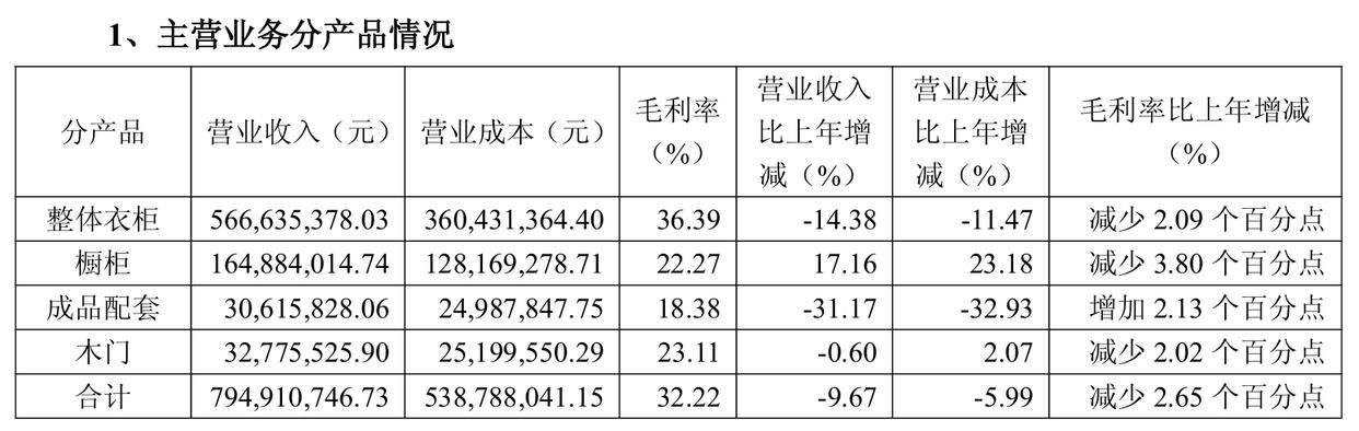 分产品来看,上半年,好莱客整体衣柜、橱柜、木门毛利率同比分别减少2.09%、3.8%、2.02%。公司成品配套毛利率同比增长2.13%,但营收下滑31.17%。