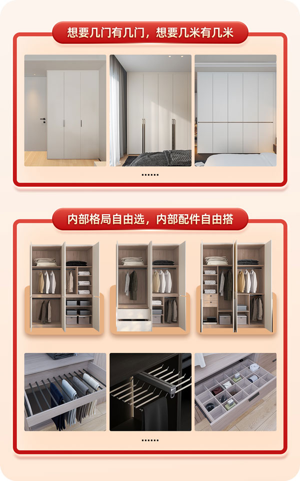 明码实价:6款花色、64种内部格局,一口价透明消费环保保障:ENF级板材,远超国标环保要求极速交付:15天闪电送装,打破定制行业周期瓶颈好莱客·莱住轻定制衣柜支持内部组件自由搭配,兼容多种收纳需求,搭配收边条实现严丝合缝,真正实现“零容错自助式定制”。
